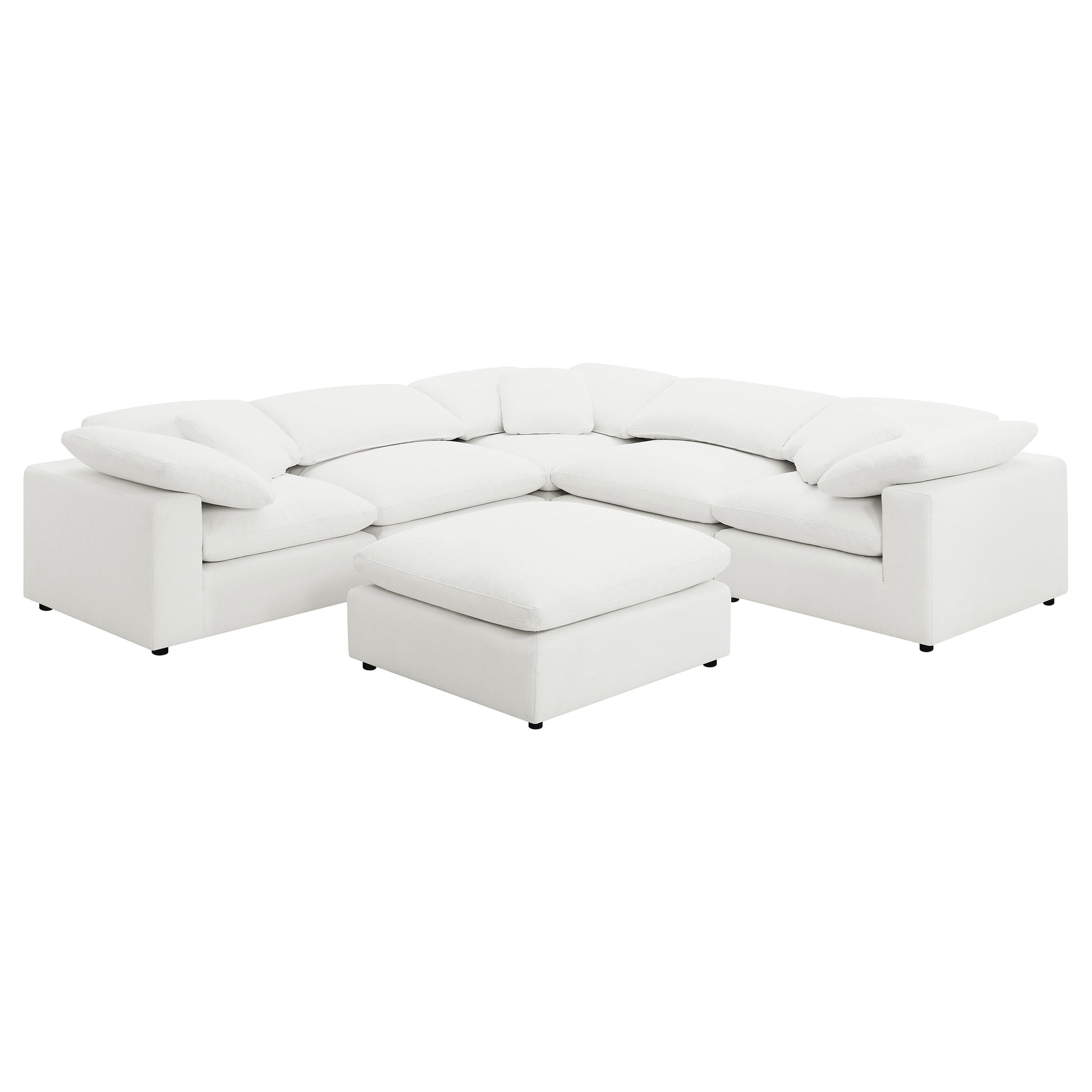 Center your relaxed living space on a modern six-piece sectional sofa, taking a laid-back approach to seating. This sofa, upholstered in tailored water-resistant boucle performance fabric with topstitch details, offers a refined, contemporary style in a neutral hue, perfect for any inviting living room. Customize your seating space with modular options, allowing you to create the perfect lounging environment. The plush, feather blend filled cushions will leave you motionless in ultimate comfort, as if wrapped in airy, cloud-like seating. Wide track arms add structure to the low slung silhouette, while an included ottoman encourages relaxation and round legs provide excellent support, complete with plastic glides to protect your flooring.