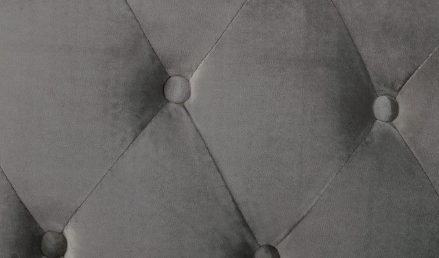 This elegantly refined bed contributes to a modest-yet-appealing atmosphere with its impressive design and stature. A fully-upholstered marvel, the durable yet caressing touch of the flannelette fabric is uniquely exquisite and the fine gray motif serves to establish the perfect reference point from which to base the bedroom's overall theme. A wide, padded, button-tufted headboard adds a sense of warmth and security, an inviting quality to the already inherent sense of comfort.