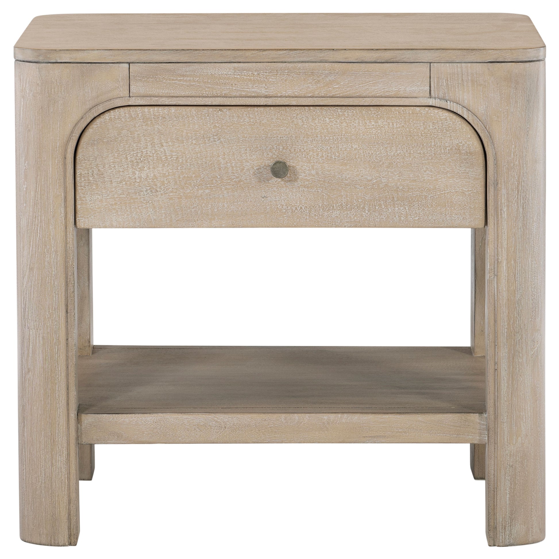 • One-drawer nightstand with rounded corners and sculpted base for soft, structured form