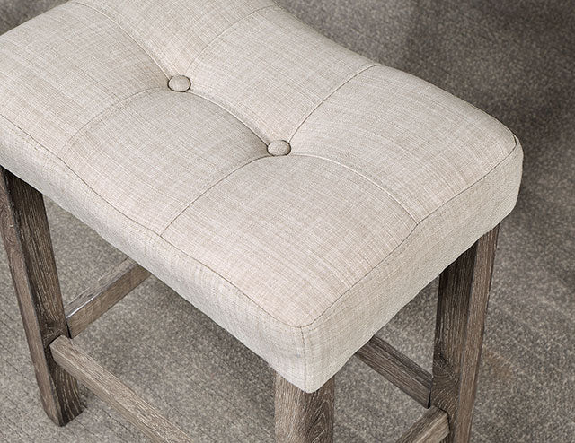 Maybe your goal is to best make use of your dining space? Don't worry, we have you covered. With the Torreon dinette set, the stools stow away easily underneath the table. The saddle seats are upholstered in bright beige linen-like fabric, which complements the gray finish of the table. True to its farmhouse-inspired design, the replicated wood grain on the table top is perfect for any space going for the rustic look.