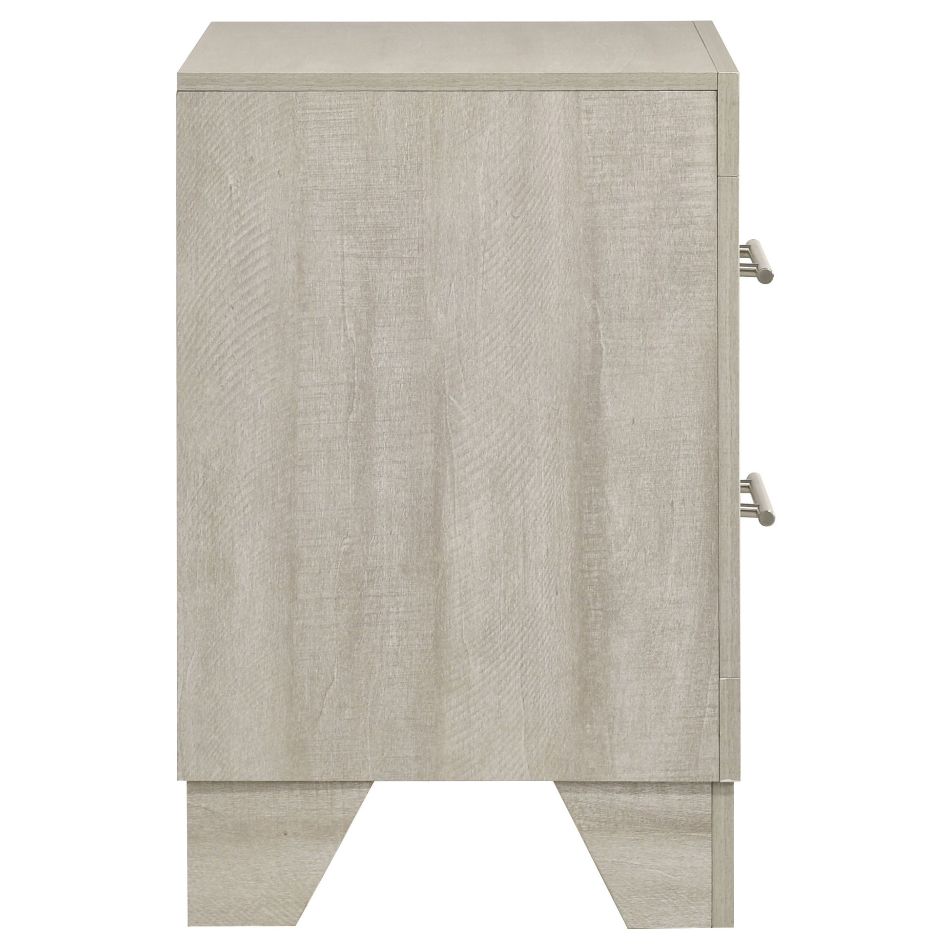 This contemporary two-drawer nightstand brings a chic blend of rustic and modern design to your bedside. Crafted with a rustic cream finish over rough-sawn, white-washed engineered paper veneer, it exudes a warm, textured appeal. Extra-wide polished nickel handles offer a sleek contrast to the rustic tones, adding a touch of sophistication. Built with engineered wood and featuring durable English dovetail joinery and Center metal glides, this nightstand is as functional as it is stylish, providing ample storage in a compact, modern silhouette.