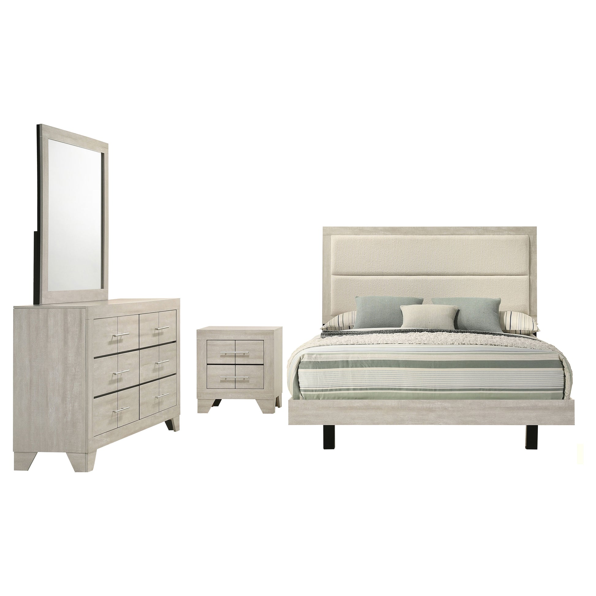 This contemporary bedroom set blends cool, modern style with rustic charm. Its Yin & Yang design pairs a rustic cream finish over engineered paper veneer with a sleek, floating bed. The headboard's padded, cream bouclé fabric adds softness, while polished nickel hardware brings shine. Crafted from rubberwood and engineered wood, drawers feature English dovetail joinery and Center metal glide for durability. This set is chic, stylish, and full of unique details.