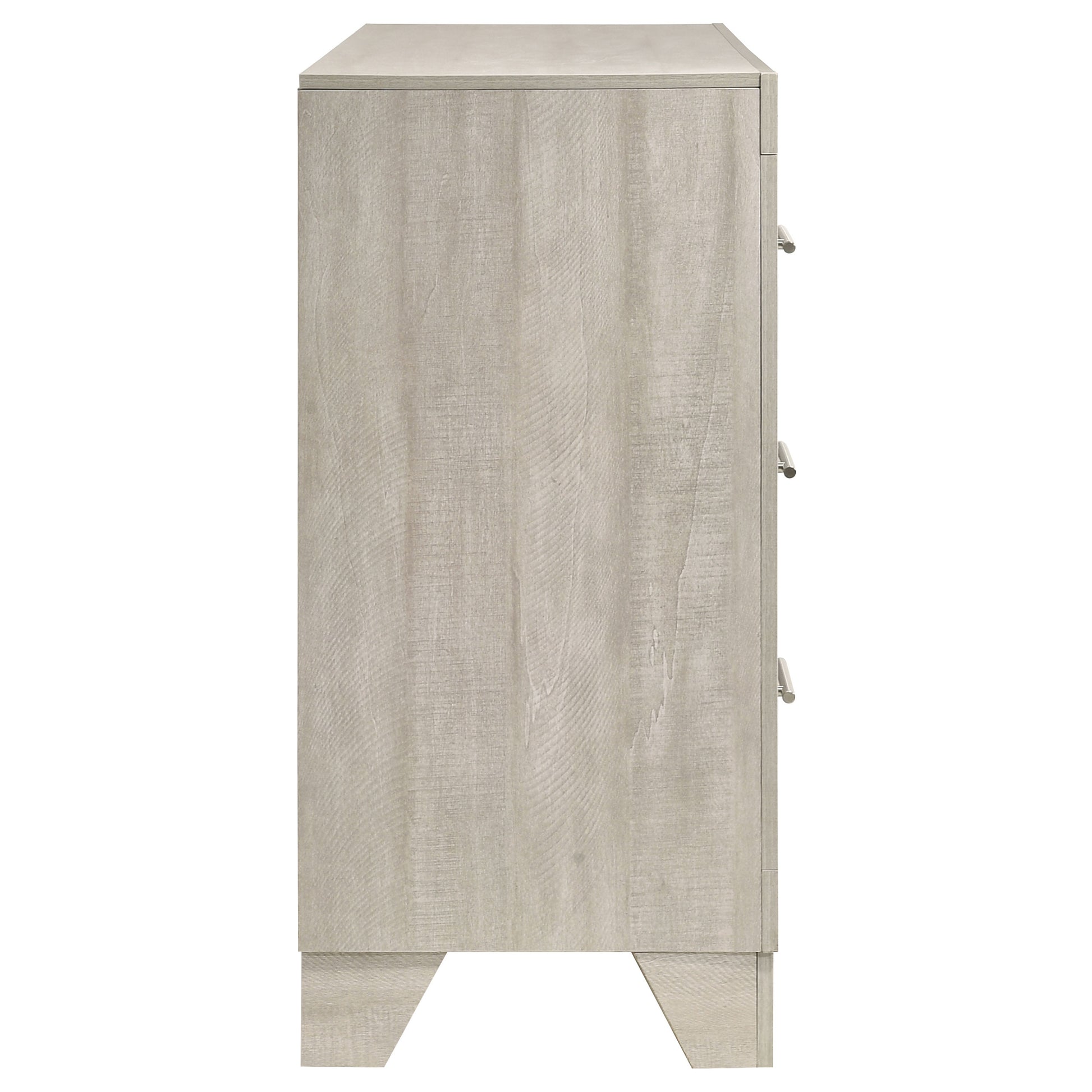 This six-drawer dresser combines modern style with a rustic edge, creating the perfect balance of elegance and functionality for your bedroom. With a rustic cream finish over rough-sawn, white-washed engineered paper veneer, it exudes a warm yet contemporary feel. The extra-wide polished nickel handles add a sleek contrast, enhancing its sophisticated look. Constructed from durable engineered wood, the dresser features English dovetail joinery and Center metal glides, ensuring smooth operation and lasting quality. Its spacious drawers offer ample storage to keep your space organized and stylish.