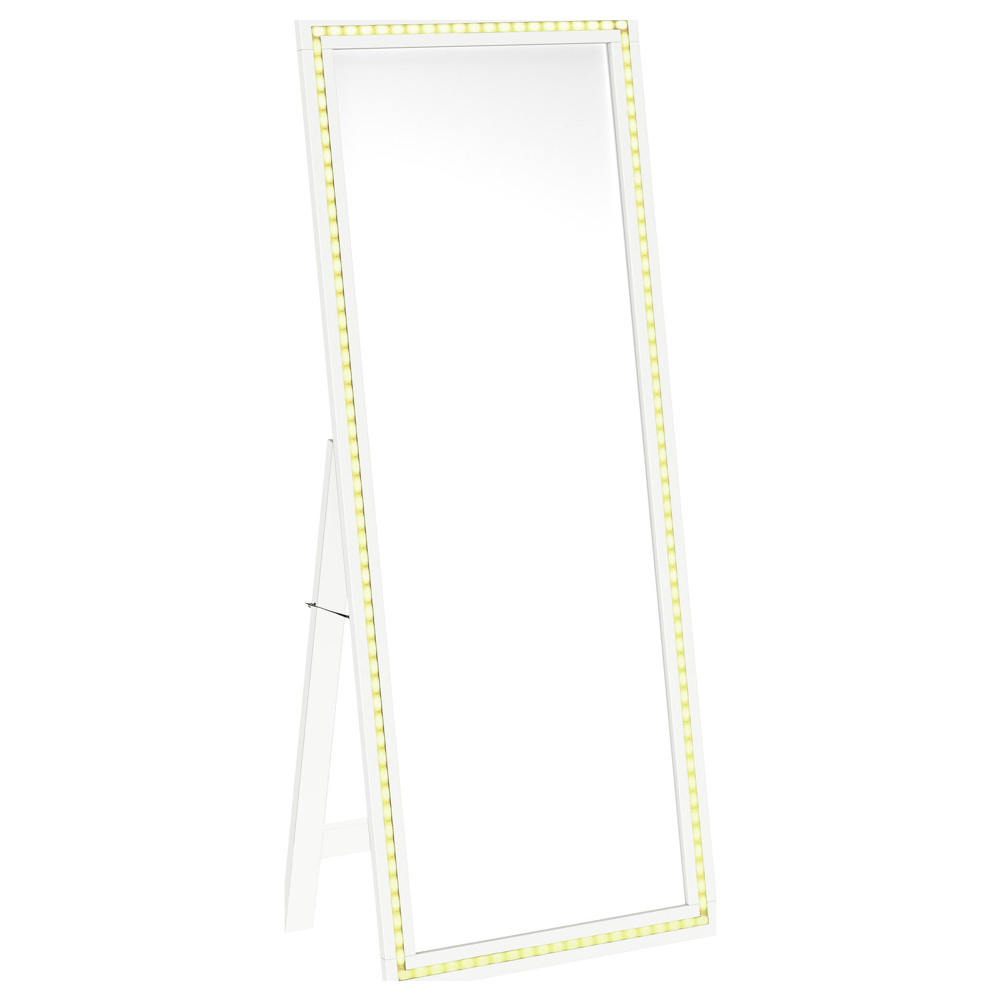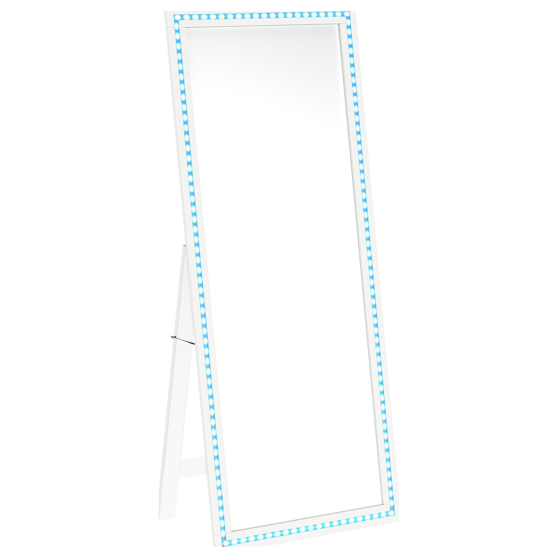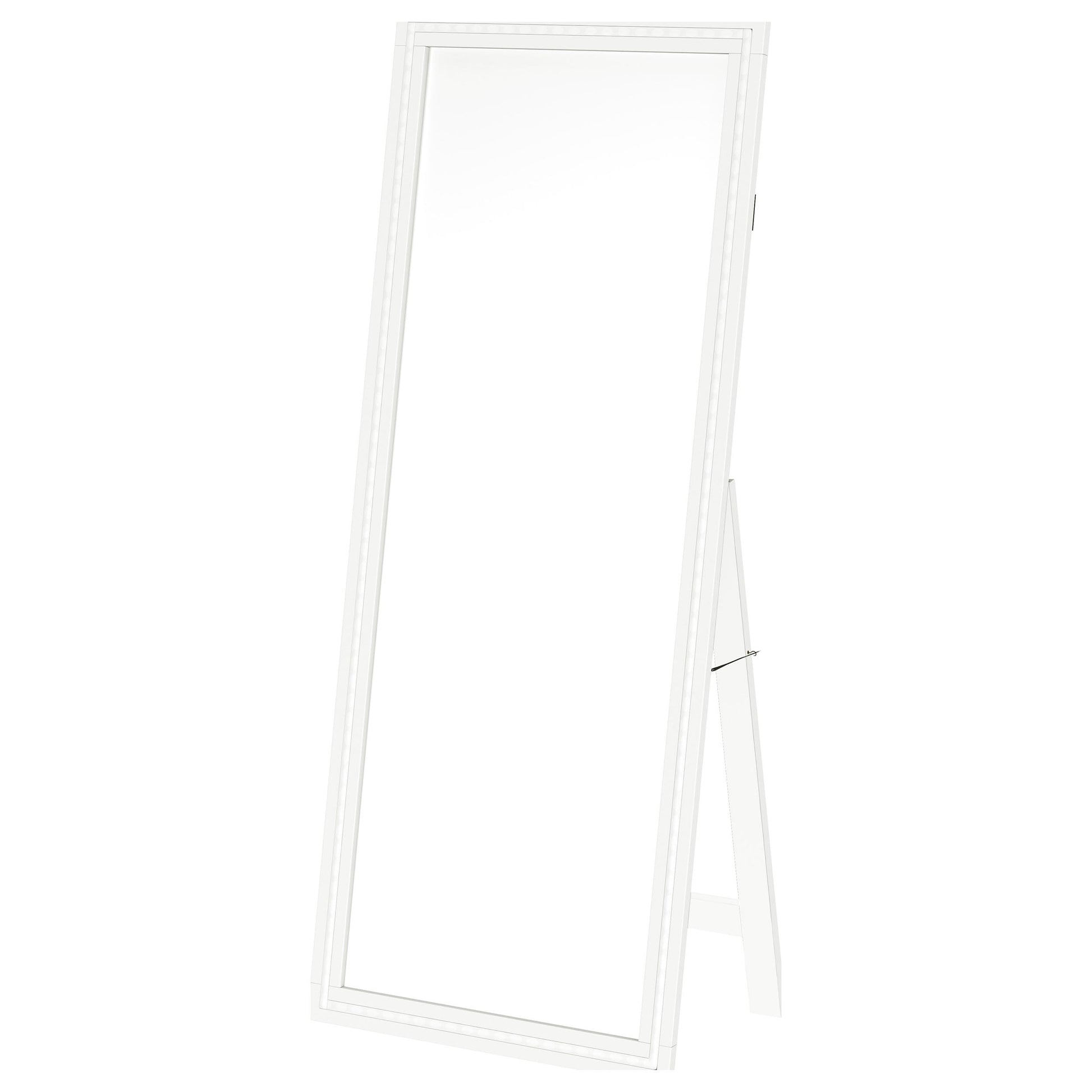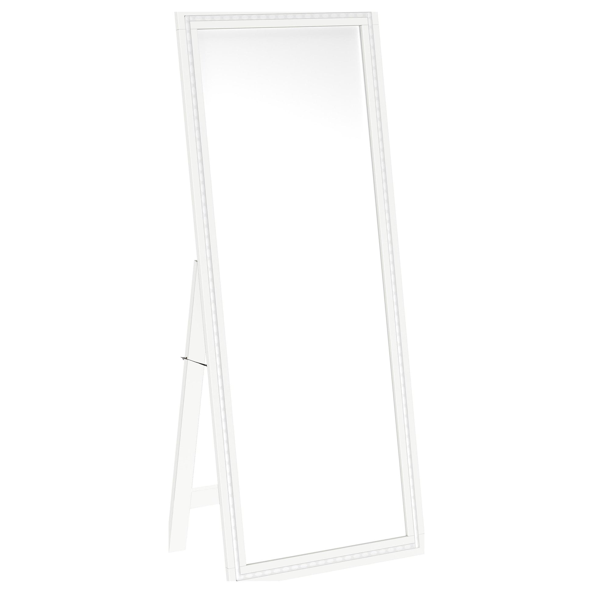 Dress up a dressing area or seating group with the glamour of a modern floor mirror. The full length design features a decorative frame complete with a support leg or its freestanding, perfect for defining an open living space or offering dimension elsewhere in your home. The mirror includes LED lighting, creating an inviting ambiance while providing light perfect for selecting jewelry or choosing your outfit. It features a neutral finish with silver trim that gleams in the light, creating a sense of depth and dimension. Choose the perfect spot for this freestanding floor mirror.